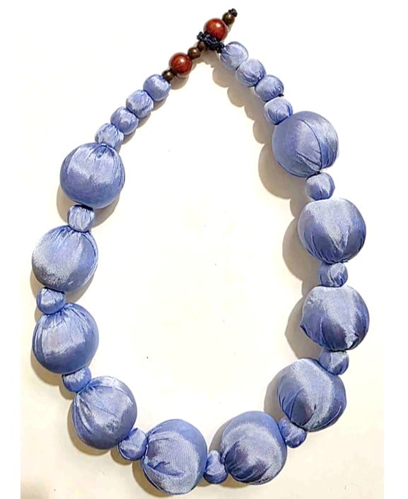 Necklace with 0.7 and 2.5 cm spheres made of wood covered with 100% natural silk.